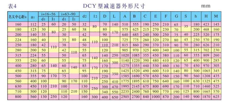 DCY、DCYK、DCZ型減速機各有15種規(guī)格,名義中心距為:160,180,200,224,250,280,315,355,400,450,500,560,630,710,800mm;每種規(guī)格均有11種傳動比(16,18,20,22.4,25,28,31.5,35.5,40,45,50)兩種旋向,四種裝配型式,分別組成660種減速機。